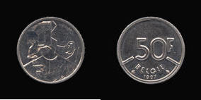 O Stylized head left, divided into three parts No Legend R Legend in three lines 50 F BELGIQUE dateCoins of Belgium