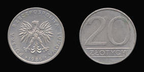 O Crowned eagle with wings spread facing, head left POLSKA RZECZPOSPOLITA LUDOWA date R Value within wreath 2 ZL O Crowned eagle with wings spread facing, head left POLSKA RZECZPOSPOLITA LUDOWA date R Figure standing to left of value, holding cloth 5 ZL O Crowned eagle with wings spread facing, head left POLSKA RZECZPOSPOLITA LUDOWA date R Value 5 ZL O Crowned eagle with wings spread facing, head left POLSKA RZECZPOSPOLITA LUDOWA date ZL 10 ZL R Head of Adam Mickiewicz left ADAM MICKIEWICZ O Crowned eagle with wings spread facing, head left POLSKA RZECZPOSPOLITA LUDOWA date R Value in two lines 20 ZLOTYCHCoins of Poland
