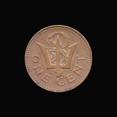 Date separated by arms, trident below each half of date, shield with Bearded Fig tree on it, Pride of Barbados flower in each upper corner, dolphin to left and pelican to right, above is a helmet and a hand holding two crossed pieces of sugarcane