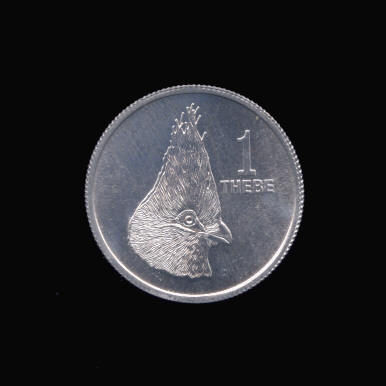 O Tribal shield with tusk and stalk on either side BOTSWANA IPELEGENG PULA date R Value to right of Turako 1 THEBE List of Coin-Issuing Countries | Dictionary of the Coin Denominations of the World | TreasureRealm Home PageAluminum 1 Thebe Coin of Botswana