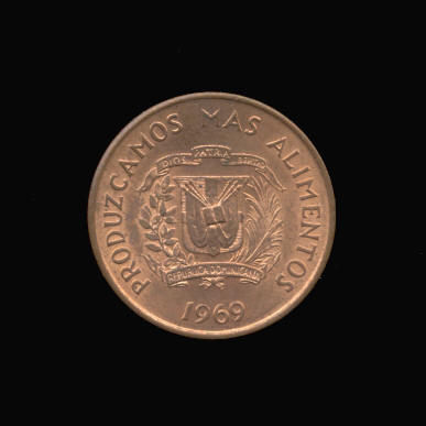 O Shield with banners above and below, stalks left and right PRODUZCAMOS MAS ALIMENTOS date R Head of Liberty left in feathered headdress UN CENTAVO 3 GRAMOS date List of Coin-Issuing Countries | Dictionary of the Coin Denominations of the World | TreasureRealm Home PageBronze 1 Centavo Coin of Dominican Republic