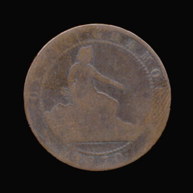 O Lion rampant right, paws resting on shield QUINIENTAS PIEZAS EN KILOG CINCO CENTMOS R Figure seated right on rock CINCO GRAMOS 1870 List of Coin-Issuing Countries | Dictionary of the Coin Denominations of the World | TreasureRealm Home PageCopper 5 Centimos Coin of Spain