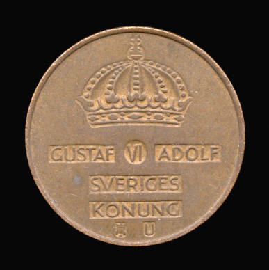 O Crown above legend GUSTAF VI ADOLF SVERIGES KONUNG R Crowned 3 date 5 ORE List of Coin-Issuing Countries | Dictionary of the Coin Denominations of the World | TreasureRealm Home PageBronze 5 Ore Coin of Sweden