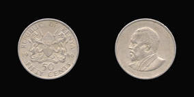 O Arms, tribal shield on stand, crossed spears behind and rampant lions either side REPUBLIC OF KENYA date 5 FIVE CENTS HARAMBEE R President Arap Moi right PRESIDENT OF REPUBLIC OF KENYA DANIEL TOROITICH ARAP MOI O Arms, tribal shield on stand, crossed spears behind and rampant lions either side REPUBLIC OF KENYA date 10 TEN CENTS HARAMBEE R President Jomo Kenyatta left No Legend O Arms, tribal shield on stand, crossed spears behind and rampant lions either side REPUBLIC OF KENYA date 10 TEN CENTS HARAMBEE R President Jomo Kenyatta left THE FIRST PRESIDENT OF KENYA MZBE JOMO KENYATTA O Arms, tribal shield on stand, crossed spears behind and rampant lions either side REPUBLIC OF KENYA date 10 TEN CENTS HARAMBEE R President Arap Moi right PRESIDENT OF REPUBLIC OF KENYA DANIEL TOROITICH ARAP MOI O Arms, tribal shield on stand, crossed spears behind and rampant lions either side REPUBLIC OF KENYA date 50 FIFTY CENTS HARAMBEE R President Jomo Kenyatta left No Legend
