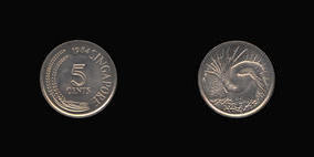 O Arms, 5 stars in circle above crescent on shield, a lion on left and tiger on right, below motto MAJILAH SINGAPURA SINGAPURA MAJULAH SINGAPURA date SINGAPORE R Vanda Miss Joaquim plants to left and right of 1 ONE CENT 1 O Sprigs to left of value date SINGAPORE 5 CENTS R Great White Egret No legend O Arms, 5 stars in circle above crescent on shield, a lion on left and tiger on right, below motto MAJILAH SINGAPURA SINGAPURA MAJULAH SINGAPURA date SINGAPORE R Fruit Salad plant above 5 FIVE CENTS 5 O Arms, shield quartered with female figure of Hope, resting right hand on rock, supporting anchor with left; two wilderbeasts left; orange tree; a wagon, crested with lion passant and having a springbok on right and oryx on left, legend EX UNITATE VIRES SUID AFRIKA SOUTH AFRICA date R Two sparrows in tree branches right 1 C O President Diederichs left SUID-AFRIKA SOUTH AFRICA date R Two birds (sparrows) in tree branches 1 C O Arms, shield quartered with female figure of Hope, resting right hand on rock, supporting anchor with left; two wilderbeasts left; orange tree; a wagon, crested with lion passant and having a springbok on right and oryx on left, legend EX UNITATE VIRES SOUTH AFRICA SUID AFRIKA date R White-tailed gnu butting left 2 C
