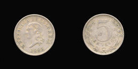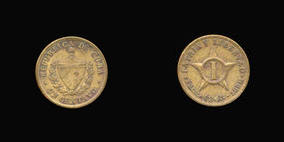 O Liberty cap within wreath REPUBLICA DE COLOMBIA date R Cornucopiae over value, sprigs with berries left and right 1 CENTAVO O Head of Liberty left REPUBLICA DE COLOMBIA date R Sprigs and stalks either side of value 5 CENTAVOS O Shield with sprigs either side REPUBLICA DE CUBA UN CENTAVO R Star with 1 in the center PATRA Y LIBERTAD 2.3 GR date 300 M O Shield with sprigs either side REPUBLICA DE CUBA VEINTE CENTAVOS R Star with rays PATRA Y LIBERTAD 5 G date 900 M O Shield REPUBLICA DOMINCANA date R Value in wreath 2 1/2 CENTAVOSCentavo Coins