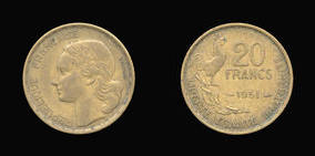 O Liberty left with flower in hair REPUBLIQUE FRANCAISE G GUIRAUD behind neck R Rooster and stalk to left of value and date 10 FRANCS date LIBERTE EGALITE FRATERNITE O Outline of France behind monogram REPUBLIQUE FRANCAISE date R Industrial scene with value across 10 FRANCS O Legend on outside ring, value and date on center plug, three sets of criss-crossing lines LIBERTE EGALITE FRATERNITE 10F date R R F on center plug, winged fiugre with star on head carrying torch between R F O Liberty left with flower in hair REPUBLIQUE FRANCAISE G GUIRAUD behind neck R Rooster and stalk to left of value and date 20 FRANCS date LIBERTE EGALITE FRATERNITE O Capped head of Liberty right holding torch REPUBLIQUE FRANCAISE R Stalks and leaves to right of value and date LIBERTE EGALITE FRATERNITE 100 FRANCS dateFranc Coins