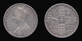 O Gothic type, bust of Victoria crowned left, WW behind bust within linear circle, Godless type VICTORIA REGINA 1849 R Crowned cruciform shields, leek, rose, shamrock, and thistle in angles ONE FLORIN ONE TENTH OF A POUND O Gothic type, bust of Victoria crowned left, WW below bust Victoria d:g:brit: reg: f:d: date R Crowned cruciform shields, leek, rose, shamrock, and thistle in angles One florin one tenth of a pound O Gothic type, bust of Victoria crowned left, WW and die number below bust Victoria d:g:britt: reg: f:d: date R Crowned cruciform shields, leek, rose, shamrock, and thistle in angles One florin one tenth of a pound O Gothic type, bust of Victoria crowned left, older portrait, 34 arcs in border Victoria d:g:britt: reg: f:d: date R Crowned cruciform shields, leek, rose, shamrock, and thistle in angles One florin one tenth of a pound O Jubilee bust of Victoria crowned left VICTORIA DEI GRATIA R Crowned cruciform shields with arms, scepter in angles BRITT: REG: date FID: DEF: