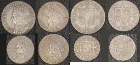 O Crowned bust of Charles II left CAROLVS II D G·M B F & H·REX value R Shield with arms (harp and lions), cross behind CHRISTO AVSPICE REGNO O Laureated and draped bust of Charles II right CAROLVS·II· DEI·GRATIA R Interlinked Cs crowned date ·MAG·BR·FRA·ET·HIB·REX· O Laureated head of James II left IACOBVS·II· DEI·GRATIA R Crowned value date ·MAG·BR·FRA·ET·HIB·REX· value O Laureated, draped, and cuirassed bust of George II left, young bust GEORGIVS·II· DEI·GRATIA· R Crowned value value date ·MAG·BRI·FR·ET·HIB·REX· O Laureated, draped and cuirasseed bust of George III right, young bust GEORGIVS·III·DEI·GRATIA· R Crowned value value date ·MAG·BRI·FR·ET·HIB·REX·Maundy- Coins