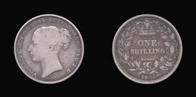 O Filleted head of Victoria left, first head, WW on truncation VICTORIA DEI GRATIA BRITANNIAR: REG: F: D: R Value in wreath, crown above ONE SHILLING date O Filleted head of Victoria left, second head VICTORIA DEI GRATIA BRITANNIAR: REG: F: D: R Value in wreath, crown above ONE SHILLING date O Filleted head of Victoria left, second head VICTORIA DEI GRATIA BRITANNIAR: REG: F: D: R Value in wreath, crown above, die number above date ONE SHILLING date O Filleted head of Victoria left, third head VICTORIA DEI GRATIA BRITANNIAR: REG: F: D: R Value in wreath, crown above, die number above date ONE SHILLING date O Filleted head of Victoria left, fourth head VICTORIA DEI GRATIA BRITANNIAR: REG: F: D: R Value in wreath, crown above ONE SHILLING date