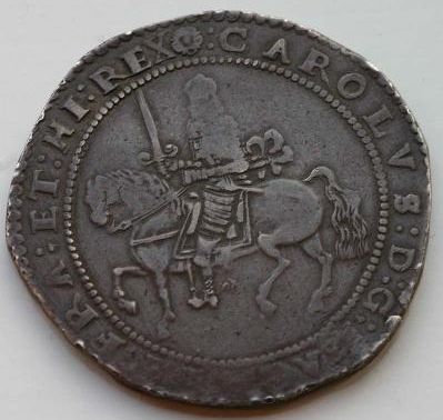 O King on horseback left, sword upright in right hand, sash in large bow; rose mintmark CAROLVS D G MAG BRI FRA ET HI REX R Round garnished shield with arms (lion, fleur de lis, harp); rose mintmark CHRISTO AVSPICE REGNOS3055 Crown Coin of Charles I
