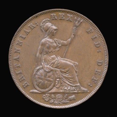 O Laureated bust of George IV left GEORGIUS IV DEI GRATIA date R Britannia seated right on rock holding trident and resting shield against right side, floral emblem below BRITANNIAR: REX FID: DEF:S3824 Halfpenny Coin of George IV