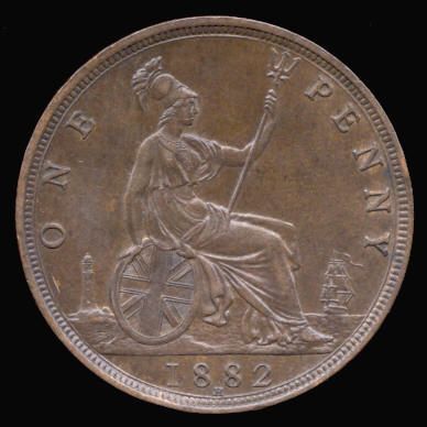 O Laureated bust of Victoria left, bun head VICTORIA D:G: BRITT:REG:F:D: R Britannia seated right, holding trident and shield, lighthouse behind, ship under sail to right, H (Heaton) below date ONE PENNY dateS3955 Penny Coin of Victoria