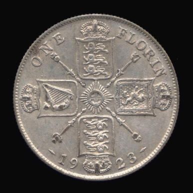 O Bare head of George V left, shallow portrait GEORGIVS V D. G.BRITT: OMN: REX F. D. IND:IMP: R Four crowned shields arranged in cross, scepters in angles ONE FLORIN dateS4022A Florin Coin of George V