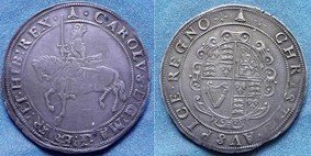 O King on horse left, sword upright in right hand, horse is without caparisons, type 3a, bell mintmark CAROLVS D G MAG BR FR ET HIB REX R Oval shield with arms (lion, fleur de lis, harp), no CR above; bell mintmark CHRISTO AVSPICE REGNO O King on horse left, sword upright in right hand, horse is without caparisons, type 3a, crown over bell mintmark CAROLVS D G MAG BR FR ET HIB REX R Oval shield with arms (lion, fleur de lis, harp), no CR above; crown mintmark CHRISTO AVSPICE REGNO O King on horse left, sword upright in right hand, horse is without caparisons, type 3a, anchor over tun mintmark CAROLVS D G MAG BR FR ET HI REX R Oval shield with arms (lion, fleur de lis, harp), no CR above; anchor mintmark CHRISTO AVSPICE REGNO O King on horse left, sword upright in right hand, horse is without caparisons, type 3a, bell mintmark CAROLVS D G MAG BRI FRA ET HI REX R Oval shield with arms (lion, fleur de lis, harp), no CR above; bell mintmark CHRISTO AVSPICE REGNO O King on horse left, sword upright in right hand, horse is without caparisons, type 3b CAROLVS D G MAG BRI FR ET HI REX R Oval shield with arms (lion, fleur de lis, harp) with plume above; portcullis, crown, tun mintmarks CHRISTO AVSPICE REGNOCrown Coins