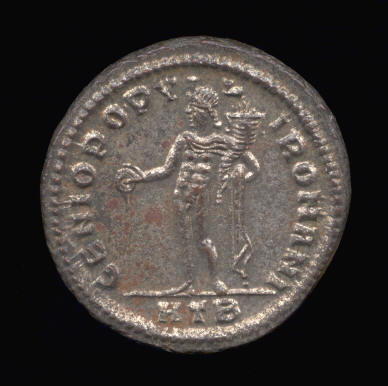 Genius of the Roman people standing left, modius on head, naked but for chlamys over left shoulder which hangs low, right hand holding patera from which liquor flows, left hand a cornucopiae