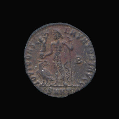 Jupiter standing facing, head left, chlamys hanging from left shoulder, right hand holding Victory (who crowns Jupiter) on globe, left leaning on scepter; eagle with wreath in beak at feet to left