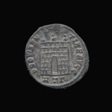 Roman Bronze Follis of Licinius I (0308AD-0324AD) O 20 Laureated bust of Licinius I draped left, scepter in left hand, mappa in right hand R IMP LICI-NIVS AVG Camp gate with three turrets, no doors; 7 layers of stones