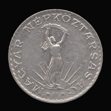 Woman walking left, holding up frond with both hands, sun with rays behind
