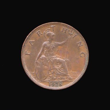O Bare head of George V left, modified effigy GEORGIVS V DEI GRA:BRITT:OMN:REX FID:DEF:IND:IMP: R Britannia seated right on rock by sea, holding shield and trident FARTHING date Coins of England, Ireland, Scotland, and Great Britain for Sale | TreasureRealm Home PageS4061 Farthing Coin of George V