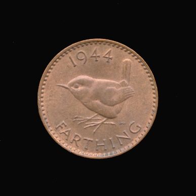 O Bare head of George VI left (wartime composition) GEORGIVS VI D:G:BR:OMN:REX F:D:IND:IMP. R Wren standing left date FARTHING Coins of England, Ireland, Scotland, and Great Britain for Sale | TreasureRealm Home PageS4116b Farthing Coin of George VI