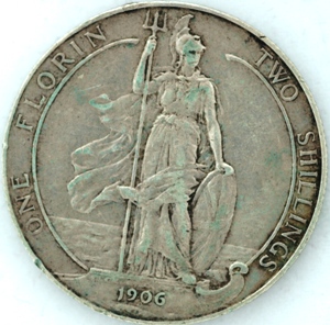 O Bare head of Edward VII right EDWARDVS VII D: G: BRITT: OMN: REX F:D: IND: IMP: R Britannia standing right on prow on shore, holding trident and shield ONE FLORIN TWO SHILLINGS date Coins of England, Ireland, Scotland, and Great Britain for Sale | TreasureRealm Home PageS3981 Florin Coin of Edward VII