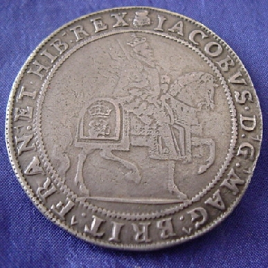 Crowned figure of James I on horseback right, sword over shoulder, crowned rose on hindquarters, plain or grass ground line