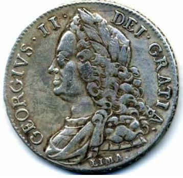 Laureated, draped, and cuirassed bust of George II left, old bust, LIMA below, regnal year on edge in words